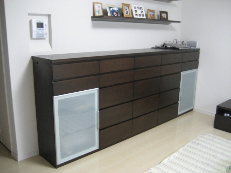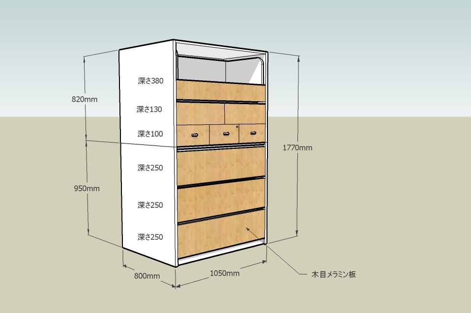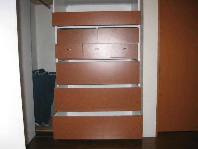 クローゼットの中にぴったり納まるチェストの依頼でした 市販のチェストより奥行きがタップリあり収納も余裕です もちろんスライドレール仕様で引出しいっぱいまで引き出せます 一番上にはハンドバックを収納 大切な物は鍵付き引出し 下3段は深さも250以上 W.1050 x D.800 x H.1770 兵庫県・N様 クローゼットの中のチェスト |