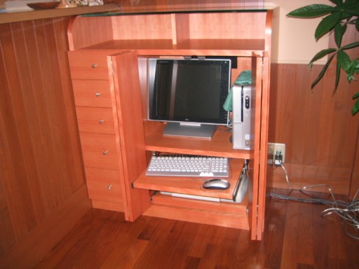 まったくパソコンを外から見せないで 家具として造って欲しいとのご要望でした 使うときはスライドレールを引き出して使います プリンターも収納しています 引き出しはA4サイズが入ります リビングダイニングに納めても インテリア家具として違和感がありません カバ桜材チェリー色仕上げ 大阪府O様 別注家具/パソコン収納 |