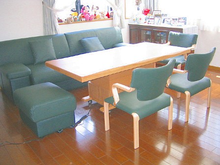 年配のご家庭で ダイニングとリビングのご相談があり ソファーやイスを別注で造る事になり やはりテーブルは便利な昇降テーブルを 造る事に決まり 色々とメカを探し いいのがありました 電動リモコン昇降テーブルです ソファーの両肘は収納 スツール下の大きな収納 イスも私のオリジナル食堂イスの 脚を短くしてLDチェアーに、 張地はソファーと同じ革張り 昇降テーブルの参考写真 オーダー家具・電動リモコン昇降テーブル |