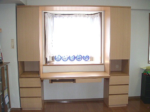 実は打ち合わせに半年以上かかっています。 壁面全体に収納を造る計画でしたが 今回は一部を製作しました 将来TV収納など追加図面は完成して ジョイントなど出来るようになっている 収納棚左のオープン部にはプリンターが収納 スライドレールで使えるようにしている デスク下にはノートパソコンが収納 すべて取っ手がなく手掛け 引き出しはスライドレール 壁面全体が完成したらすばらしいインテリアになります オーク材ナチュラル仕上げ 広島市M様 オーダー家具・パソコンテーブルと収納棚 |