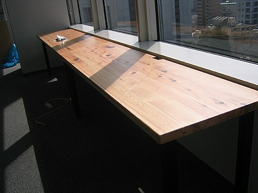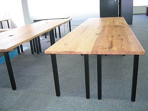 花粉症で悩まされる嫌われ者の杉 あまりにも多くなった杉を利用していろんなアイデアで商品や建築に 使われています 値段は安いが運賃がかかる 伐採してから山を下ろすのに大変な苦労です 山の奥地や斜面から下ろしてきます 輸入材のほうが安い 各県とも補助金など出して苦労しているそうです 今回この杉の集成材でパソコンテーブルを作りました モダンなオフィスでパソコン20台が並びます 600 x 2000 x h.720 天板40厚 杉のテーブル |